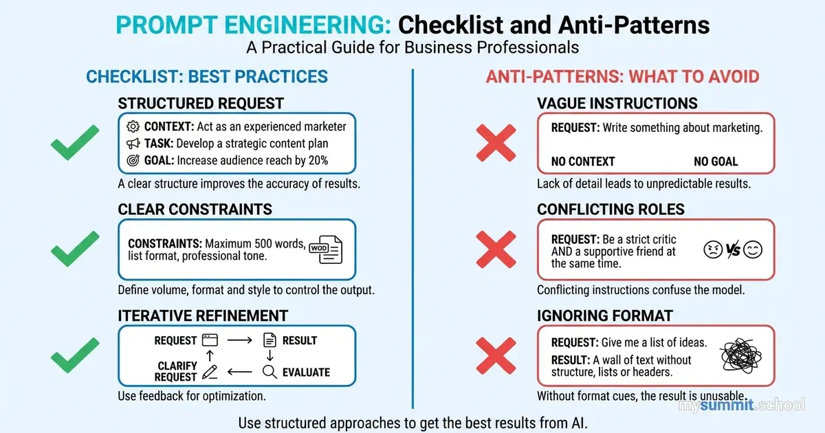 We’ve covered prompt structure, the persona pattern, and working with long texts. Now – a practical checklist and the typical mistakes that drag down the quality of AI answers.