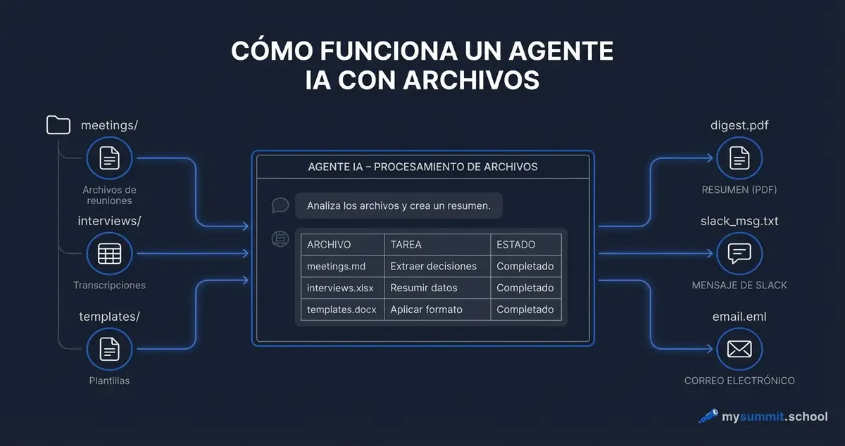 Claude Code no es un chat. Es un agente que se ejecuta en tu ordenador y trabaja con tus archivos directamente. Le das una tarea en lenguaje natural – «haz un resumen de todas las transcripciones de reuniones de marzo» – y él abre los archivos, los lee, los analiza y devuelve el resultado. Sin copiar y pegar, sin subir documentos manualmente, sin límites de tamaño de contexto.