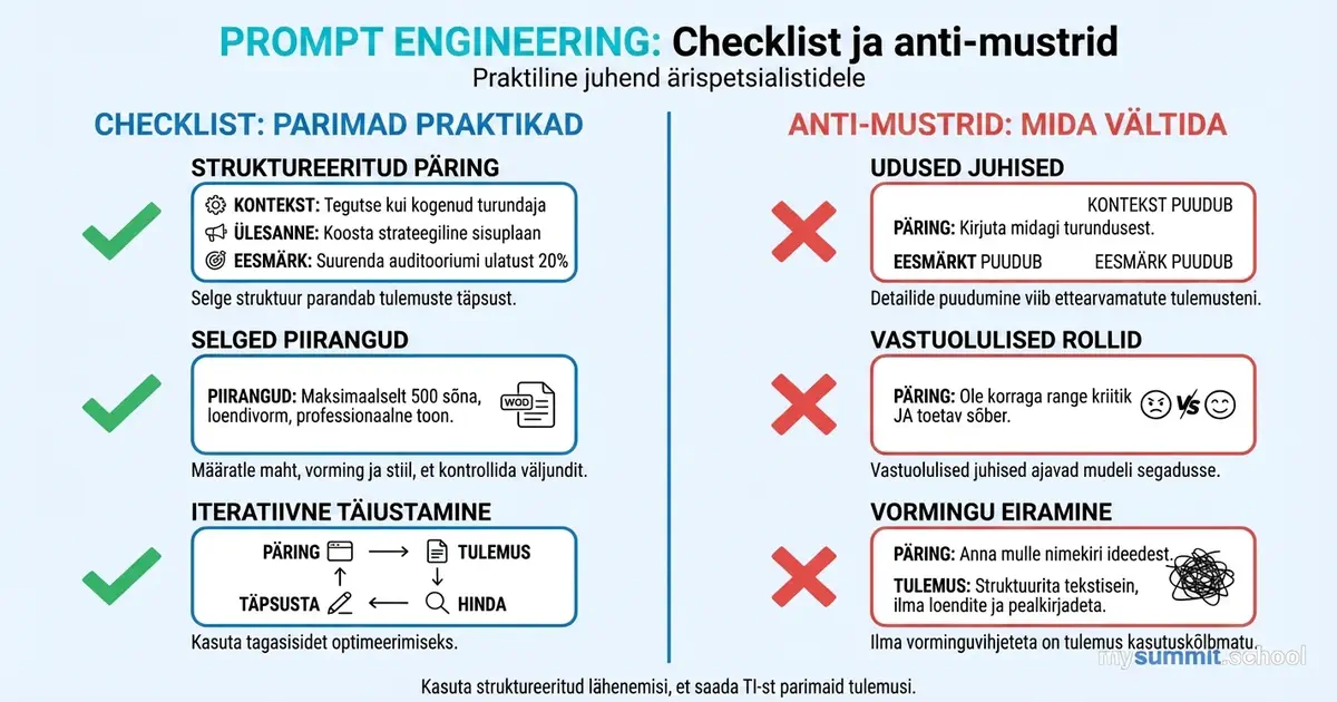 Oleme lahti võtnud prompti struktuuri, persoona ja töö pikkade tekstidega. Nüüd – praktiline checklist ja tüüpilised vead, mis langetavad AI vastuste kvaliteeti.