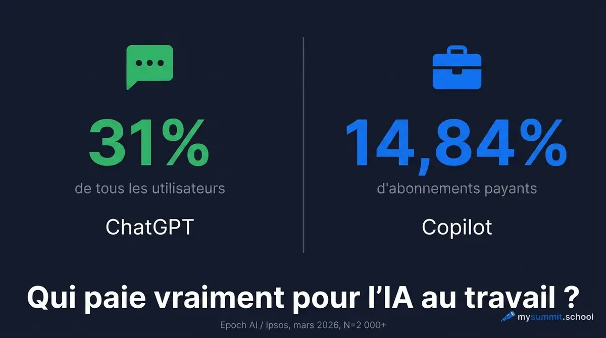D’après les données d’Epoch AI et Ipsos (échantillon probabiliste KnowledgePanel, N=2 000+ adultes américains, mars 2026), 14,84 % de tous les adultes aux États-Unis possèdent un abonnement payant à Microsoft Copilot. Un abonnement payant à ChatGPT – 7,39 %. L’écart est presque du simple au double, et il va à rebours de la manière dont les médias décrivent le rapport de force sur le marché de l’IA.